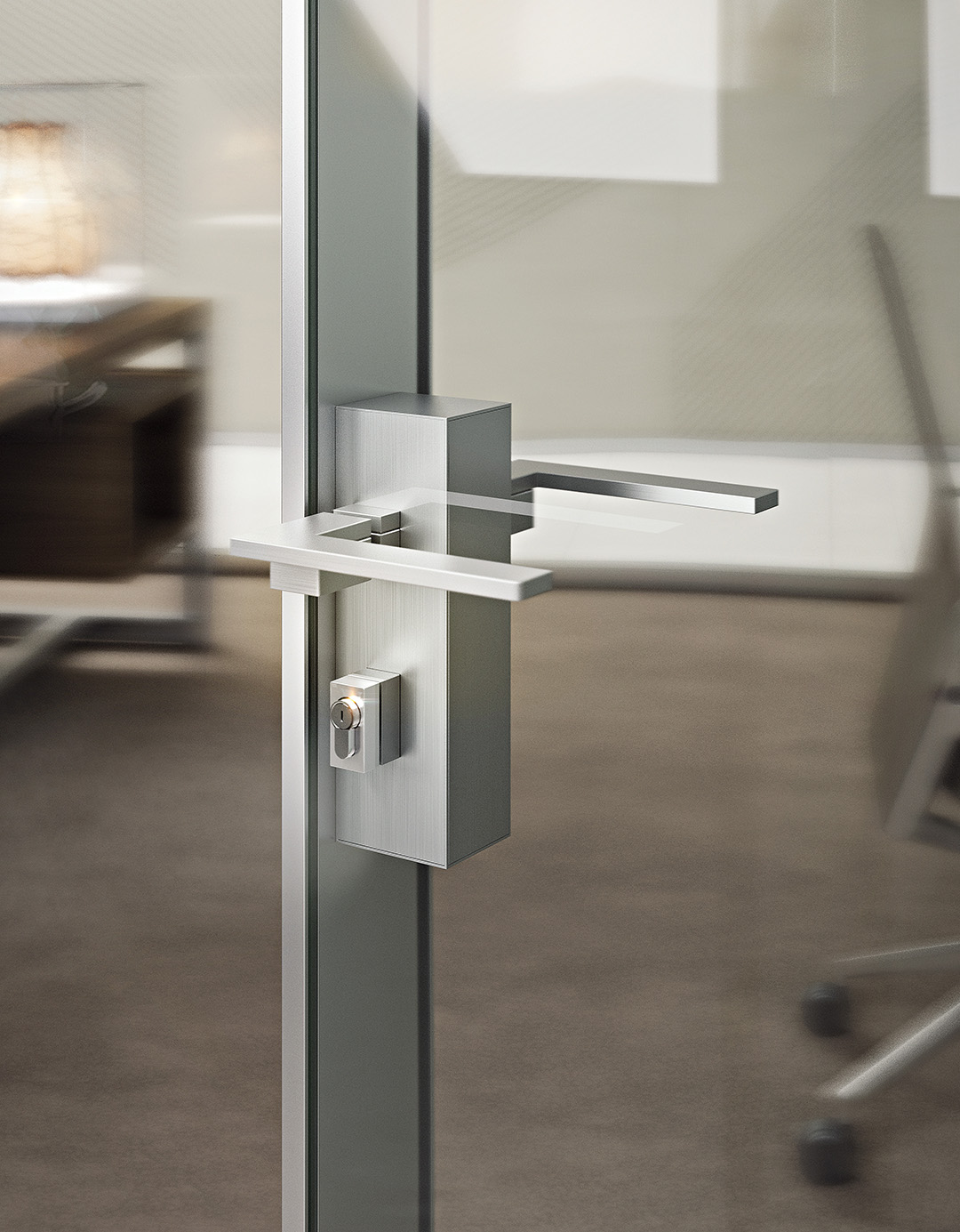 M100 share is a kit of high-performance acoustic technical profiles that provides the possibility of setting up single or double glass walls. The double glass door is highly performing and it has a double stop gasket and floor guillotine. The hinge has been patented with a high capacity. The handle lock and the handle itself are aesthetically very pleasant and entirely in aluminium.