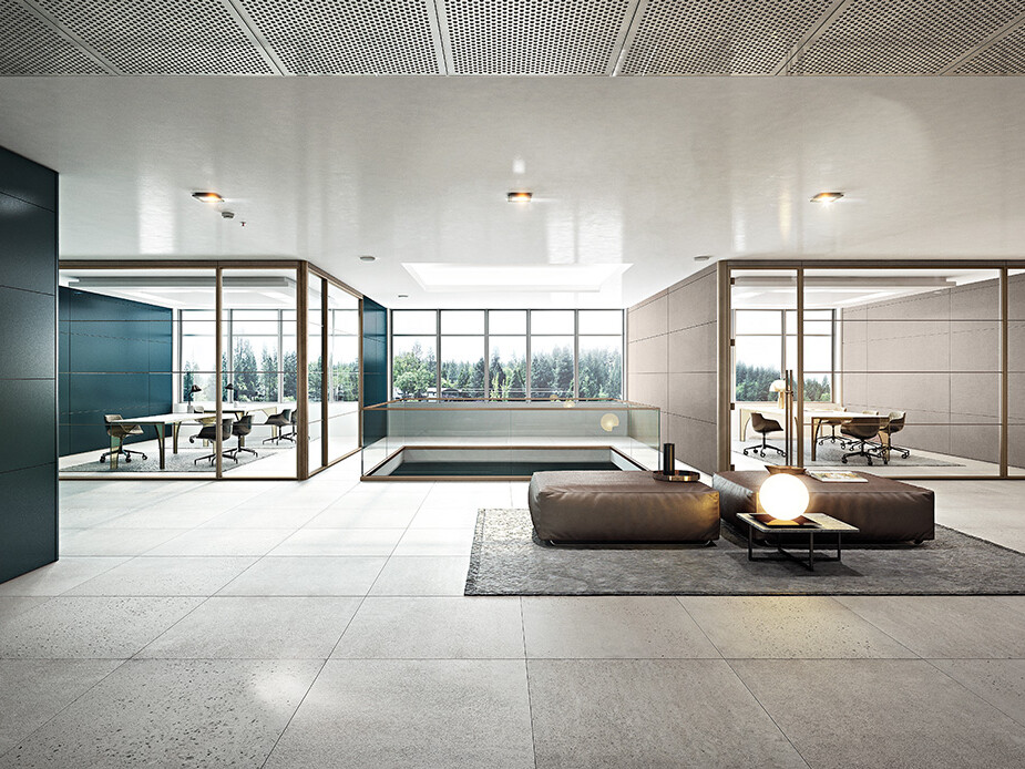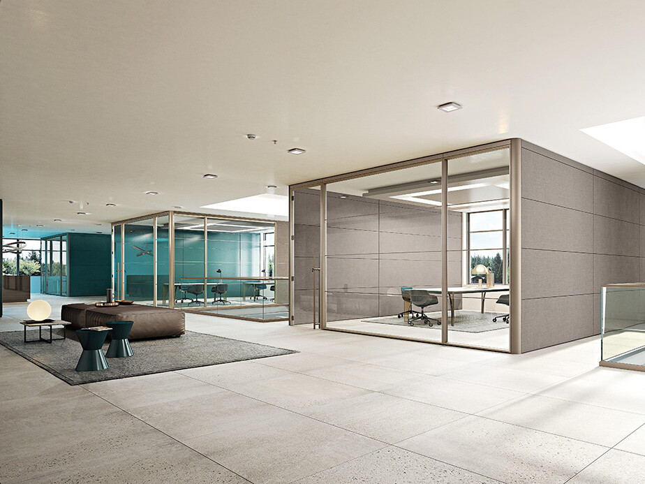 P100 structura L with single glass, the linear and essential version of the classic P100 structura partition wall, fitted with new technical and aesthetic features.