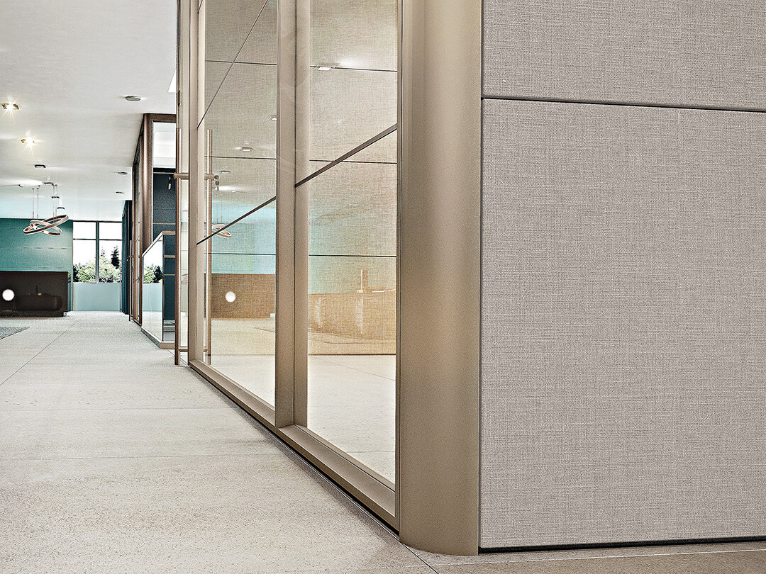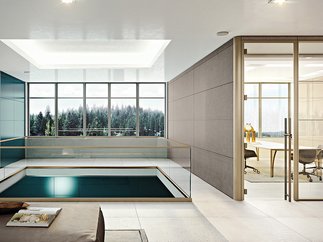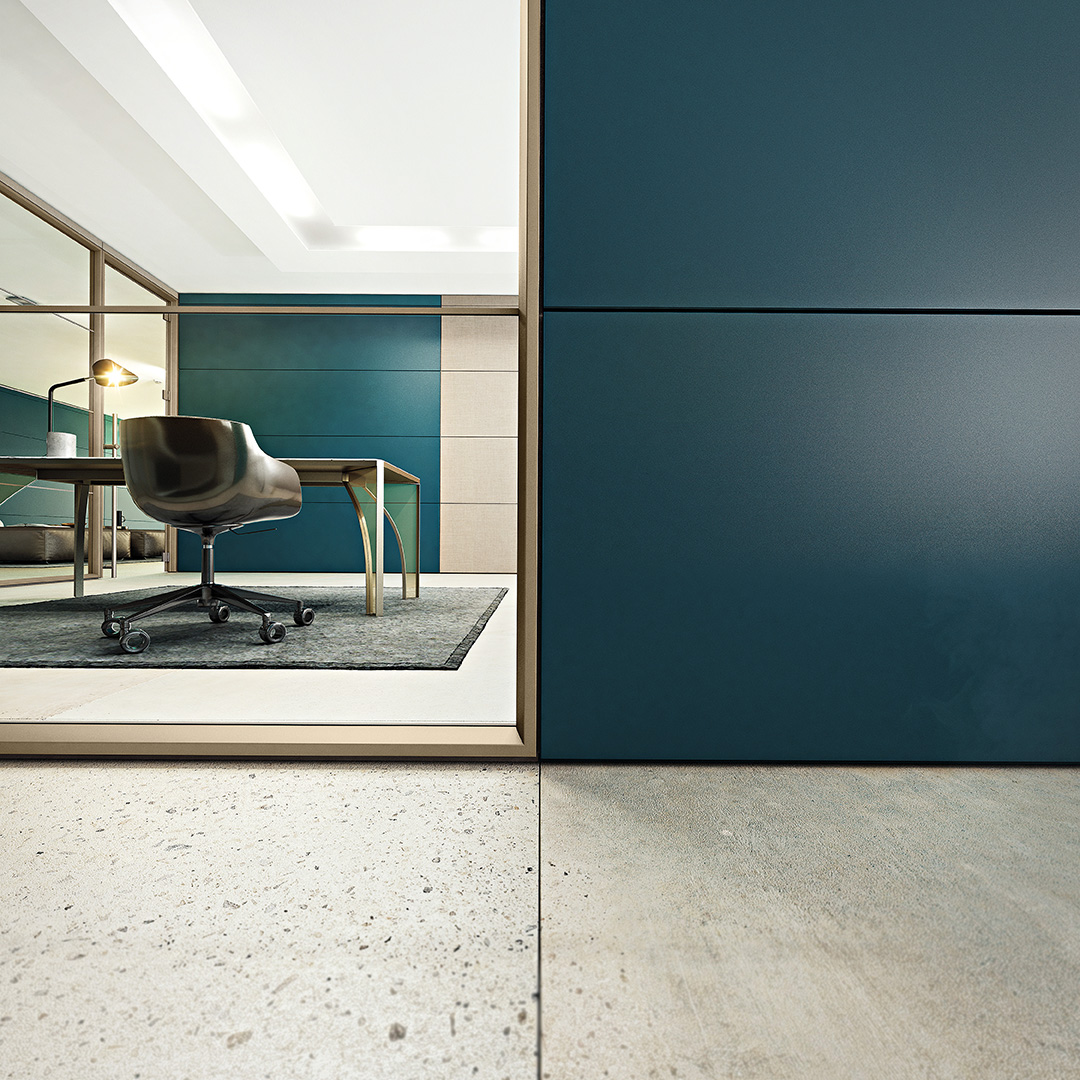 P100 structura with panel glossy lacquered finishing Ral 6004 and panel melamine finishing Tessuto Wall profiles in Velvet Normal Golden Parapet profiles with glass finishing Velvet Golden Normal Single glass with aluminium insert.