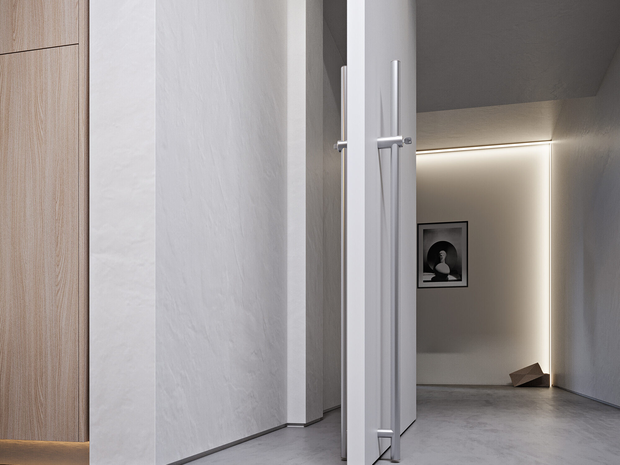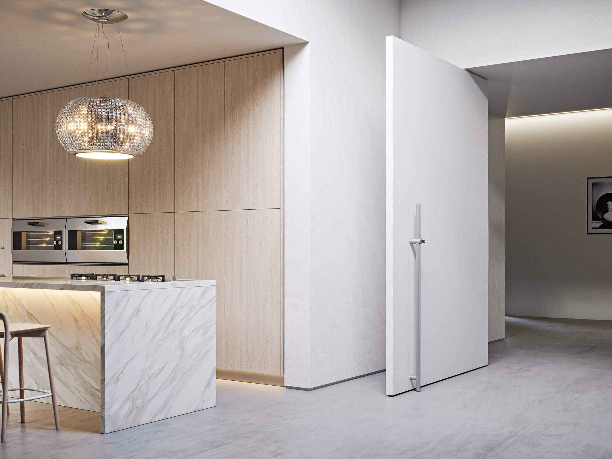 SEMPIONE è una porta girevole dal design sofisticato, dotata di cerniere a scomparsa posizionate in alto e in basso, con un asse di rotazione DECENTRATO che ne esalta l’unicità. A porta chiusa, si fonde perfettamente con la parete, diventando parte integrante dell’ambiente. Una volta aperta, si trasforma in una SCULTURA CINEMATICA, capace di sorprendere per eleganza e dinamismo.